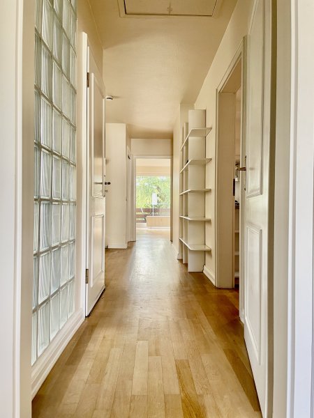 Hauptwohnung mit 105 qm Wohnfläche, 4,5 Zimmern, 2 Bädern, Küche und Balkon, verteilt auf zwei Stockwerken. Herzstück: ein geräumiges Wohnzimmer oben mit Eichenparkett (komplette obere Etage!) und wundervollem Blick auf den ruhigen, grün angelegten Garten – ein Anblick, der einem die Stadt vergessen lässt. Der Spitzboden bietet zusätzlichen Stauraum.