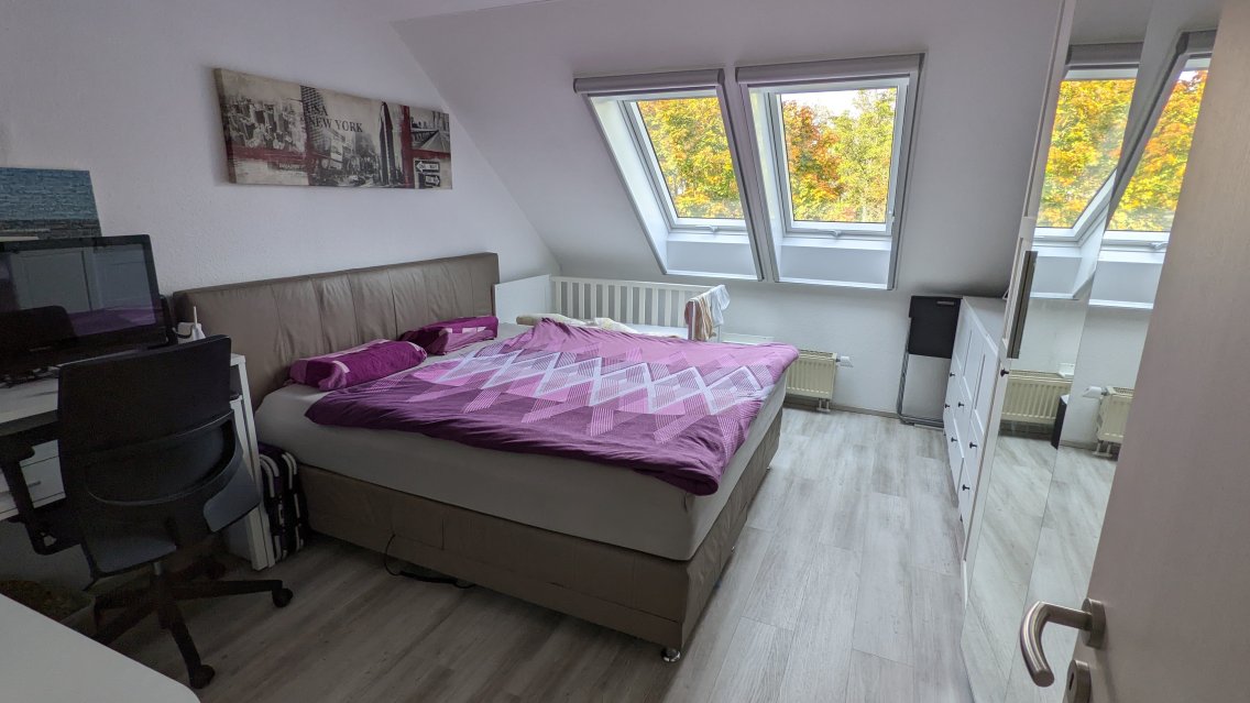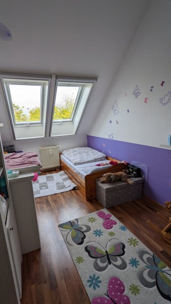 Über eine praktische Wendeltreppe gelangen sie in das 2. DG. Dort erwarten Sie zwei weitere lichtdurchflutete Zimmer sowie ein Tageslichtbad mit Wanne.