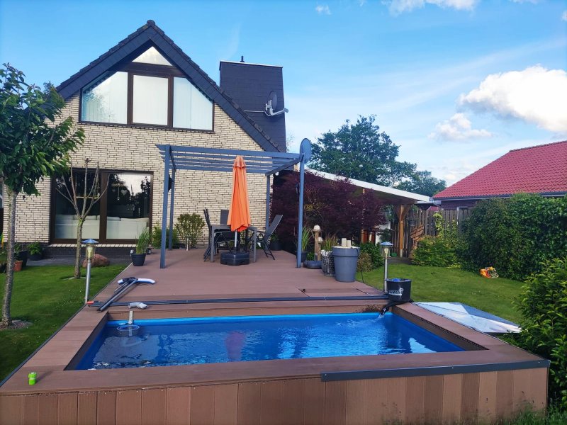 Der Garten verfügt über 3 Terrassen. Und einen Salzwasser Pool. Eine Überdachte Outdoor Küche lädt zum Grillen ein.