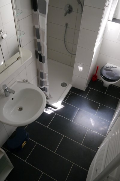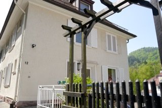 Das Haus hat eine solide Bausubstanz, ist voll unterkellert, hat Parkett- bzw. Dielenböden. Derzeit ist es aufgeteilt in vier Wohnungen auf vier Etagen: Im Erdgeschoss und im 1. Obergeschoss ist jeweils eine Drei-Zimmer-Wohnung (je 65 qm) mit Küche und TGL-Duschbad. Alle Zimmer gehen von einem Flur ab. Zwei der Zimmer sind außerdem durch eine Schiebetür verbunden. Die Räume haben schöne alte Dielenböden oder Parkettböden. Im Dachgeschoss ist eine Drei-Zimmer-Wohnung (54 qm) mit Küche und TGL-Bad. Im Untergschoss ist ein Studio (16 qm) mit Küchenzeile und TGL-Duschbad. Es gibt drei abschließbare Einzelgaragen. Auf das Garagendach führt eine Treppe, es ist begehbar und kann als Terrasse genutzt werden. Es gibt eine kleine Terrasse im Garten, Grünfläche und eine wunderschöne Rose. Das Dach ist sehr gut. Das Dachgeschoss könnte ausgebaut werden: Entweder als weitere wohnung oder um die Dachgeschosswohnung zu einer Maisonette-Wohnung zu erweitern. Das DG ist vermietet, die drei anderen Wohnungen sind frei. Etwa die Hälfte der Fenster ist neu. Die letzte Sanierung war 2012: Bäder, Küchen und Stromleitungen wurden erneuert. Das Haus hat eine ruhige Lage in einer Sackgasse, die im letzten Teil eine Privatstraße ist, direkt am Waldrand, mit weitem Blick über das Tal. Einkaufsmöglichkeiten, Bushaltestelle, Schulen, Ärzte, Gastronomie ist in Fußweite. Es gibt vielfältige Gestaltungsmöglichkeiten: als Heim für eine Familie, Mehrfamilienhaus, Wohnen und Arbeiten unter einem Dach.