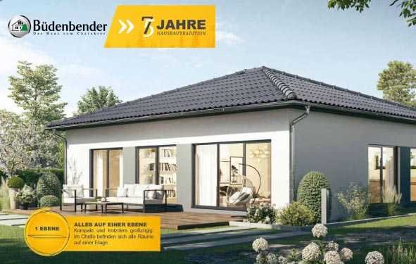 Der moderne, kompakte Bungalow Chello 105 öffnet sich zur Terrasse und Gartenseite über die gesamte Hausbreite mit großen Fenstertürelementen. Die grauen Profile bilden einen guten Kontrast zur klaren Form des Baukörpers und dem strahlenden Weiß der Fassade. Von der Diele aus gelangt man in den offenen Koch-, Ess- und Wohnbereich, der durch die großflächige Verglasung hell und freundlich wirkt. Die zentrale Kochinsel mit Theke bildet ein besonderes Highlight im Raumkonzept.