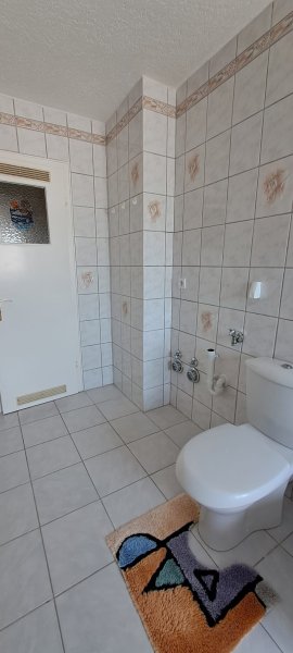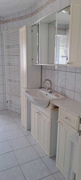 Das geräumige Bad ist mit Fenster, Badewanne, Waschbecken, WC, Bidet und Anschluß für Waschmaschine und Trockner ausgestattet.