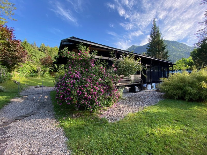 Ein Chalet, nur etwa 160 m vom See entfernt. Nah genug, um mit dem Bademantel zum Schwimmen zu gehen und weit genug weg, um nicht, aber auch gar nicht vom Lärm des Verkehrs gestört zu werden. Und direkt hinter Ihnen, der Weg auf den Heimgarten oder zum Herzogstand in wunderbarem Mischwald. Ruhe und Luft vom Allerfeinsten. Ebenso fein die Architektur dieses 1973 von einem Berliner Architekten erbauten Alpenchalets. 16 m lang und 6,50 m breit in ebenholzschwarzem Holz im EG und Beton mit thermischer Wandsanierung und Lehmputz im UG. Schlichte Bauhaus anmutende Architektur in den Bergen, ein HUF-Haus könnte es auch sein. In jedem Fall ist es zeitlos schöne Architektur mit viel Glas und der Natur so nahe, dass man meint eigentlich nicht in 145 qm, sondern in 1.214 qm zu wohnen. Für das parkähnliche Grundstück besteht kein Bebauungsplan, es gilt die Bayerische Bauordnung. Alleine zusätzlich zum Bestand, könnten 160 qm Baufläche bis Traufhöhe 6.50 m (EG+OG+DG) erweitert oder neu gebaut werden. Glasfaseranschluss im Haus (Downloadgeschwkt. 239,6 Mb`s, Upload 39,6 Mb`s.