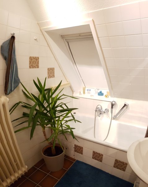 Das Badezimmer ist mit einer Badewanne ausgestattet. Die Einbauküche ist modern und bietet genügend Platz zum Kochen.