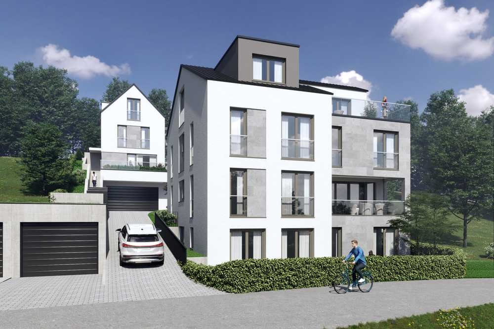 Auf dem 1.583 qm großen und herrlich eingewachsenem Sonnengrundstück mit Blick entsteht ein freistehendes Einfamilienhaus mit Doppelgarage und großzügiger Gartenanlage sowie 2 Wohnungen mit Tiefgarage und 4 PKW-Stellplätzen.