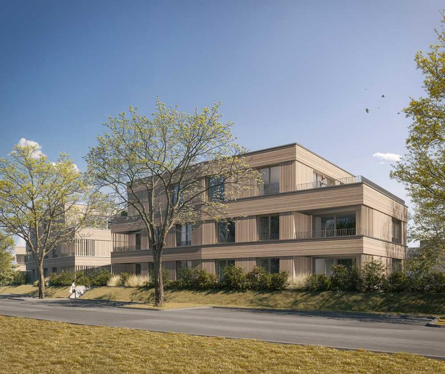 Das Gebäudeensemble „In den Hofwiesen“ beeindruckt mit seiner markanten Architektur und der individuellen Holzfassade. Die interessanten Kuben der Gebäude mit ungewöhnlicher Geometrie verleihen dem Projekt einen ganz individuellen Charakter und schaffen gleichzeitig einen von Privatheit geprägten, attraktiven Innenhof, von dem aus die Gebäude erschlossen werden.