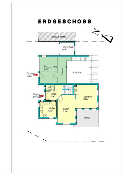 Das Büro im Garten- und Erdgeschoss, dass durch einen eigenen Eingang betreten werden kann, verfügt über 115 m². Vom Eingang erreicht man über den Besprechungsraum die Galerie, die den Blick auf das „eigentliche“ Büro im Gartengeschoss öffnet.