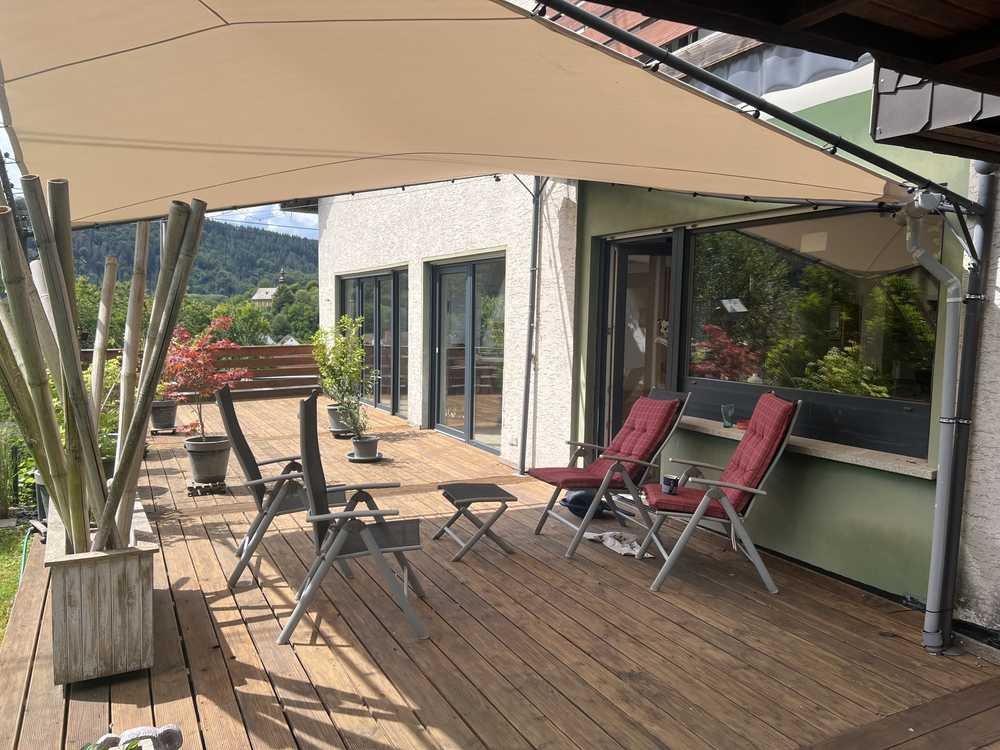 Grosses Wohn-Esszimmer mit Bodetiefen Fenstern zu Terasse