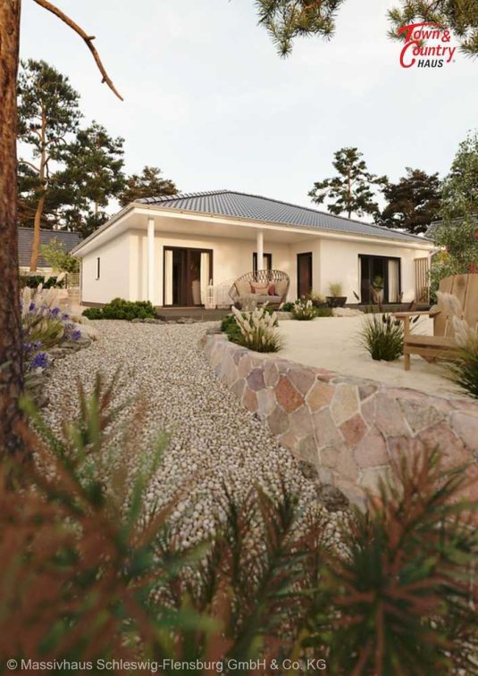 Massivhaus - Bungalow 128: Ein Bungalow, der es - im wahrsten Sinne des Wortes - in sich hat: viel Platz, keine Stufen, zwei Bäder und vieles mehr finden Sie im Bungalow 128. Dank der klugen Raumaufteilung kann der Bereich neben dem Eingang als Einliegerwohnung genutzt werden. Je nach Wunsch oder Lebensphase können Sie diese als abgeschlossenen Arbeitsbereich nutzen oder als Wohnung mit separatem Eingang vermieten.