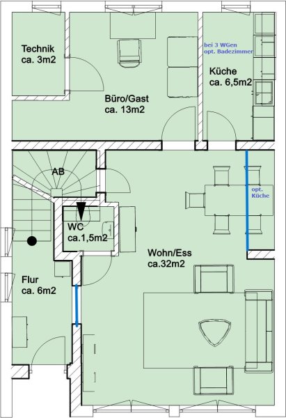 Ebenso wäre auch eine Teilung des Hauses in 3 WGen möglich.