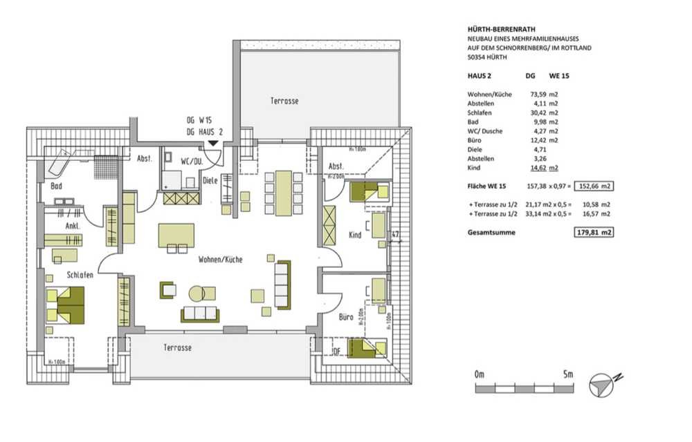 Die beiden Mehrfamilienhäuser verfügen über zwei Vollgeschosse sowie ein Dachgeschoss. Der Wohnungsmix besteht aus 3- bis 4-Zimmer Wohnungen mit einer Wohnungsgröße von 82 m2 bis 183 m2. Zu jeder Wohnung gehört (mindestens) ein Balkon oder eine Terrasse.