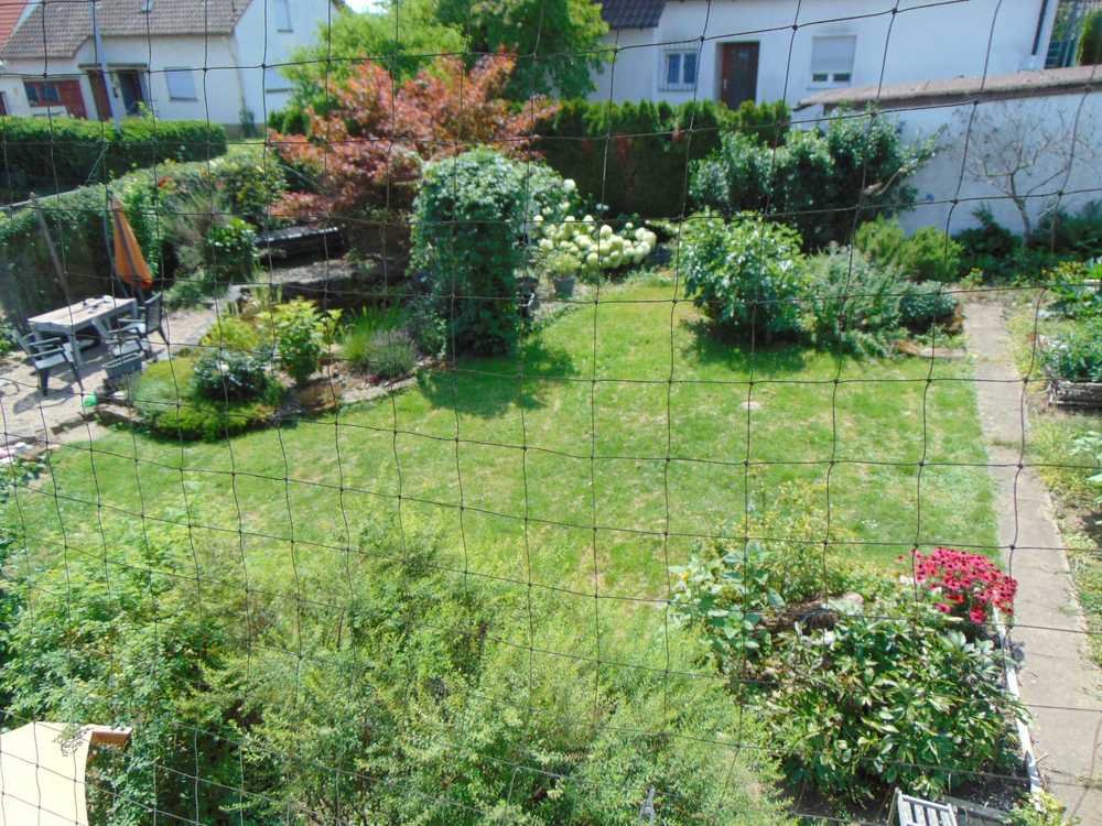 Aus der Wohnung im Obergeschoß kann man direkt in den gepflegten Garten mit Teich und Gemüsebeeten gehen, der von beide Parteien gemeinsam genutzt wird.