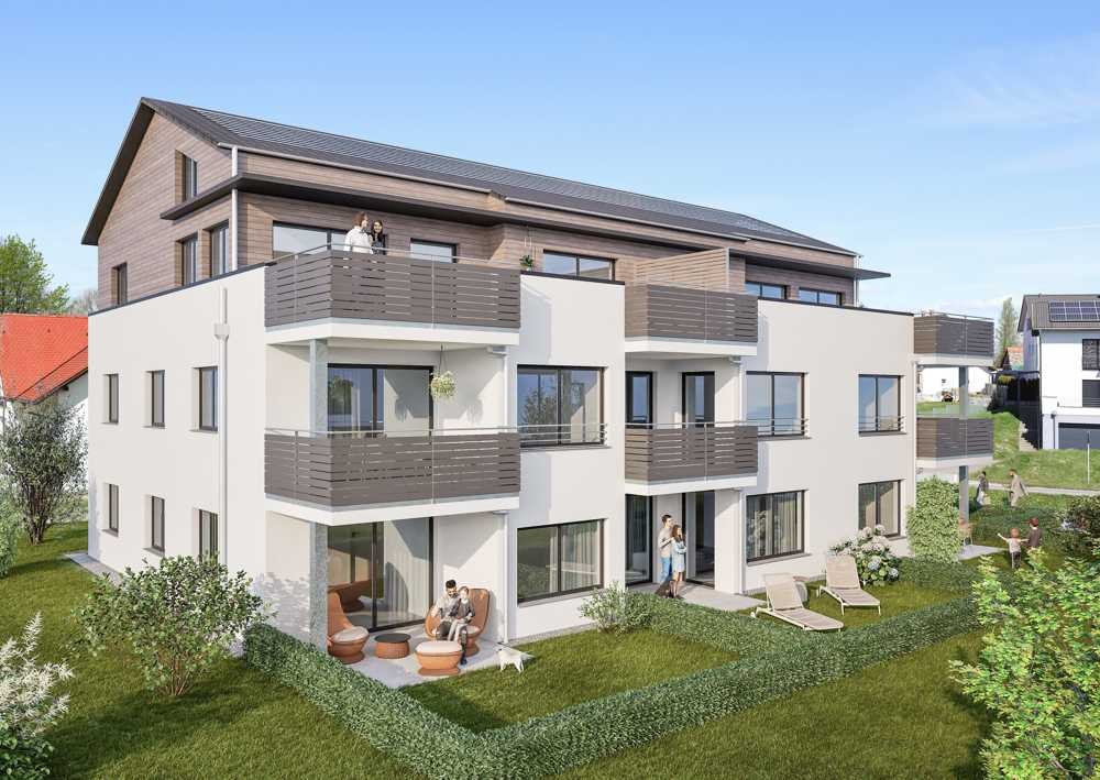 In der Seegemeinde Eriskirch, unweit des größten Naturschutzgebiets dem Eriskircher Ried, entstehen zwei Mehrfamilienhäuser auf einem großzügigen Grundstück. Die beiden Baukörper der Häuser A und B sind ideal auf dem Grundstück positioniert, sodass neben der sonnigen Ausrichtung und den großzügig dimensionierten Grünflächen ein angenehmer Abstand zwischen den Gebäuden entsteht. Die elegante Fassadengestaltung mit Akzenten in Echtholz unterstreicht das harmonische Gesamtbild.