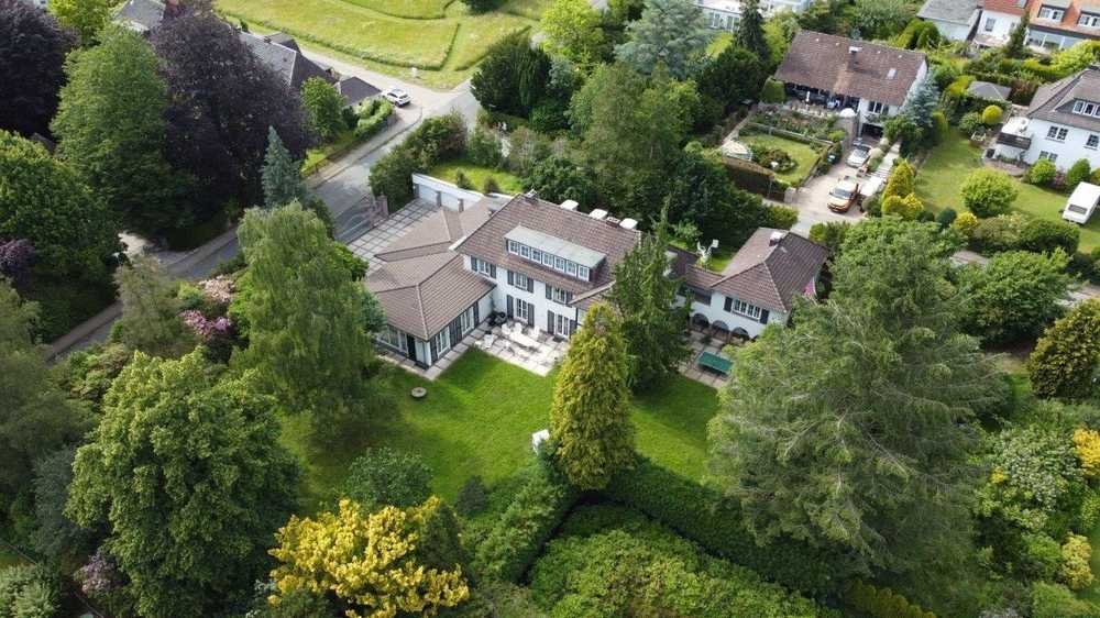 Das Haus verfügt über 2 Einfahrten, 4 Garagen, zwei Terrassen und einen durch hohe Rhododendren und eine hohe Hecke nicht einsehbarer Garten. Die kleine Arkade rund um den 2. Terrassenbereich vermittelt ein geradezu mediterranes Flair.