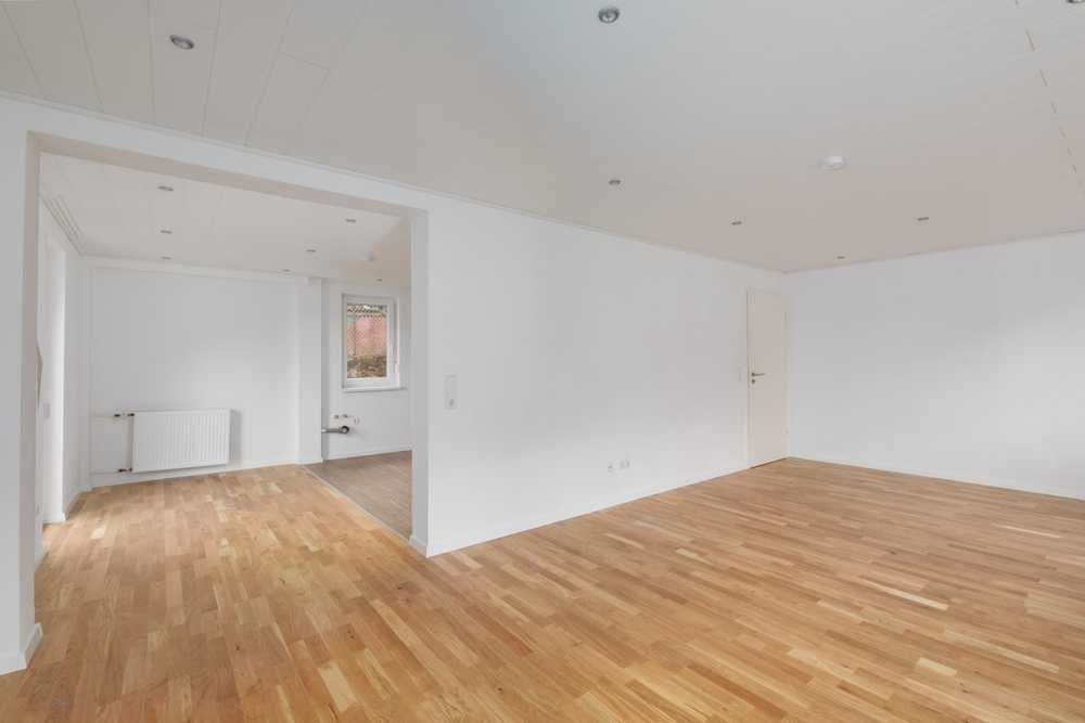 Weiter geht es im Obergeschoss. Hier befindet sich ein geräumiges Wohnzimmer mit Ausgang auf die Terrasse und die Küche mit Platz für einen Essbereich, wo die ganze Familie zusammen kommen kann.