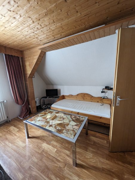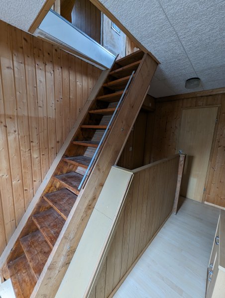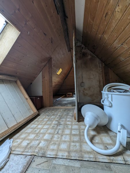 In der 1. Etage ist ein großer Wohnraum sowie ein Badezimmer (WC, Dusche), eine kleine Küche mit Esszimmer sowie ein weiterer separater Raum. Eine Holztreppe führt auf den Dachboden, der sehr gut als Lagerraum genutzt werden kann oder weiter zum Wohnraum ausgebaut werden kann.