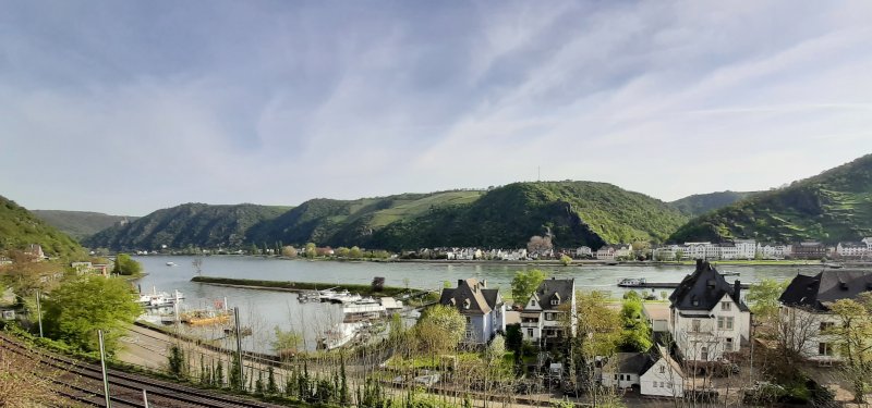 Von den Balkonen im Erdgeschoss und in der ersten Etage haben Sie einen unverbaubaren Blick auf den Rhein und das Rheintal mit den Burgen sowie auf die gegenüberliegende Schwesterstadt St. Goarshausen.