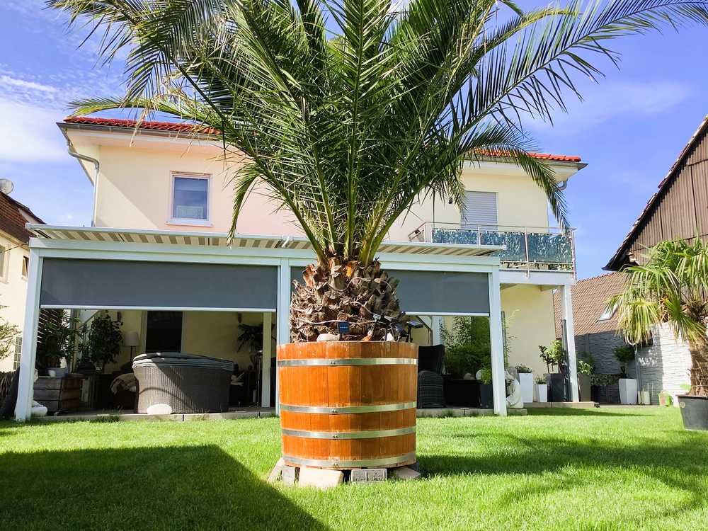 Highlight dieser Wohneinheit ist die 41 qm große überdachte und uneinsehbare Terrasse, auf der Sie den zauberhaften Ausblick in dem sehr gut architektonisch gestalteten angelegten Garten, genießen können. Sitzplätze, liebevoll angelegte Liege-Wellnessplätze mit Ausblick auf die 7m hohe Palme und herrliche Ziersträucher, sowie Hüttenzauber, sind eine Rarität dieser besonderen Immobilie. Das komplette Grundgrück ist rundherum eingezäunt. Und als Kirsche auf der Sahne, haben Sie Zutritt auf dem Privatweg zum nahegelegenen Badesee.