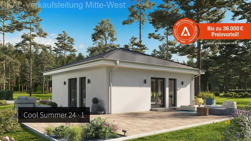 Dass sich Wohnen auf geringer Wohnfläche und ausgezeichneter Komfort nicht ausschließen, zeigt unser Tiny Single Bungalow. Beim durchdachten Wohnkonzept kommen im Besonderen Singles und Paare auf ihre Kosten, die sich auf das Wesentliche konzentrieren möchten und gleichzeitig auf maximale Behaglichkeit setzen. Highlight des Bungalows, der eine Wohnfläche von gerade einmal 73 m² bietet, ist der offene und lichtdurchflutete Wohn-Ess-Bereich sowie die direkt angrenzende Küche. Dank der offenen Aufteilung und der fließenden Grenzen entsteht ein angenehmes Raumgefühl. Das kleine Bad inklusive Dusche und WC passt sich ideal in das Konzept ein und im Hauswirtschaftsraum ist ausreichend Platz für sämtliche Technik vorhanden - für ein modernes Wohnen mit dem MEHR an Komfort. Bodentiefe Fenster schenken dem Wohn-Ess-Bereich nicht nur maximale Helligkeit, sondern ermöglichen ebenso den direkten Zugang zur Terrasse.