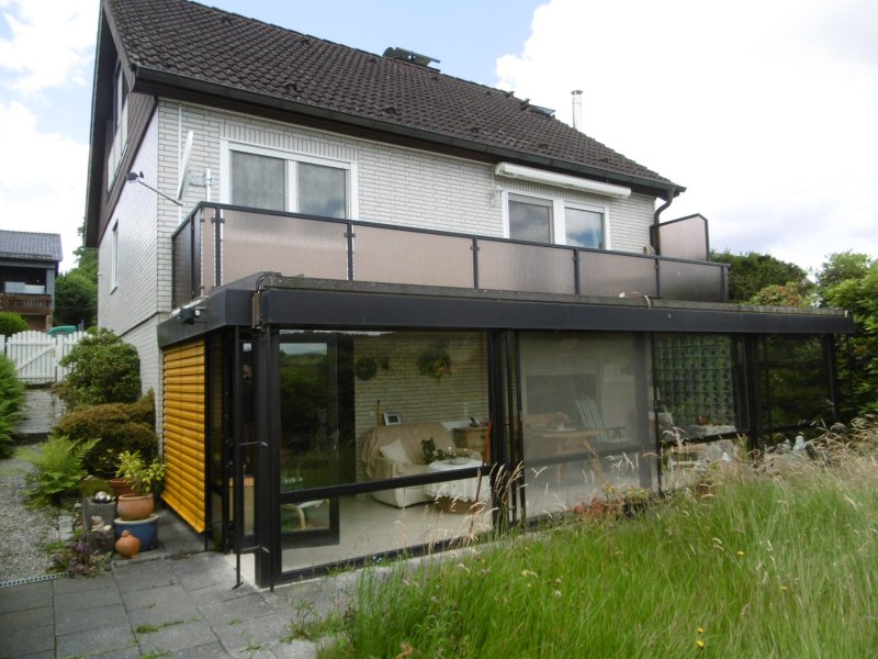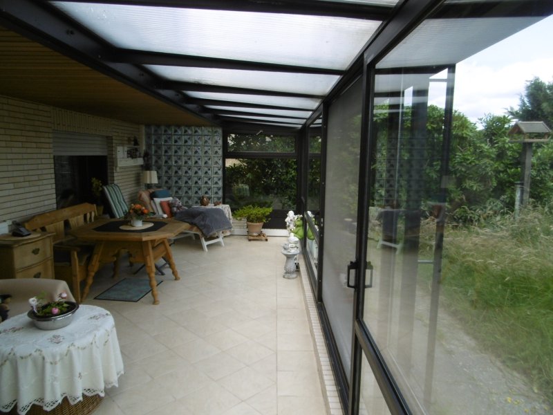 Der Wintergarten hat eine komplette, witterungsgesteuerte Verschattungsanlage der Fenster und des Glasdaches, die jedoch teilweise nicht mehr richtig funktioniert. Eine große Schiebetür eröffnet das direkte Erlebnis mit dem Garten.