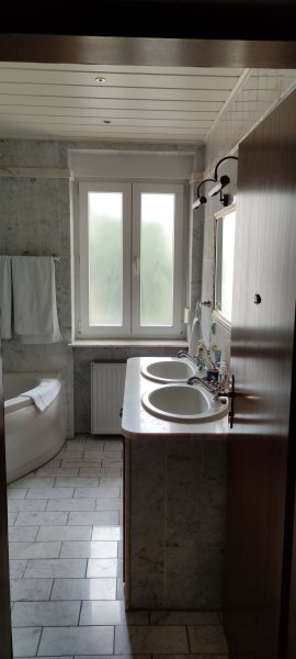 Zur Einrichtung gehört ein hochwertig ausgestattetes Tageslichtbad mit Badewanne.