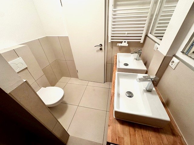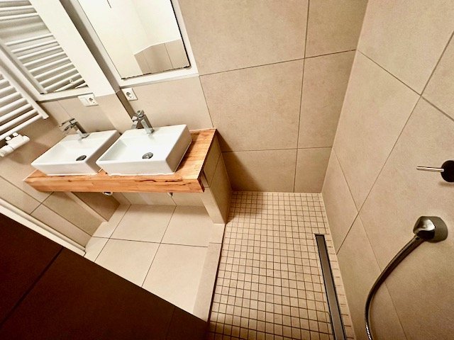 Das Badezimmer ist ein echtes Highlight mit zwei eleganten Waschtischen, einer bodengleichen Dusche mit stilvollen Mosaikfliesen und hochwertigen Armaturen. Hier lässt es sich mit frischer Energie in den Tag starten und abends wahrhaft luxuriös entspannen.