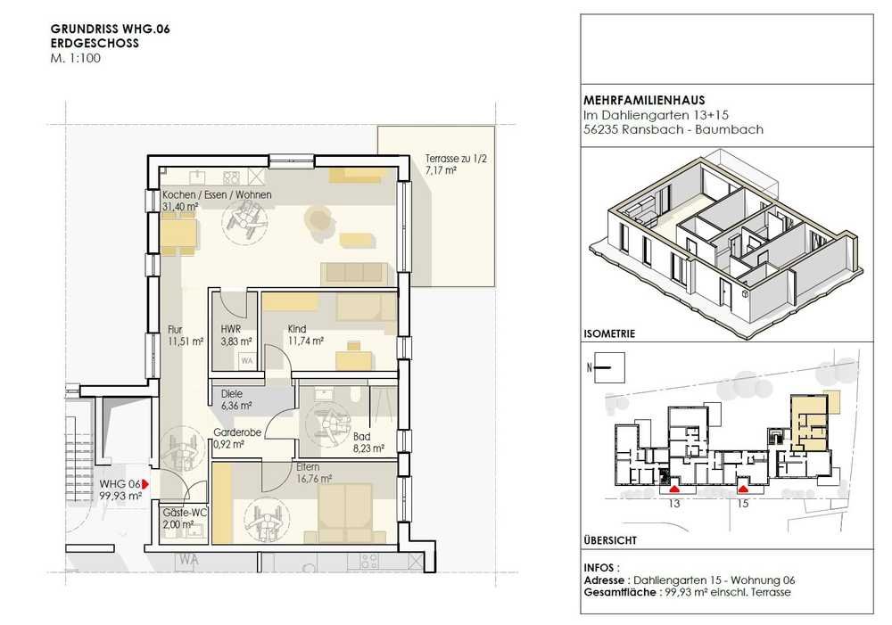 Die hier angebotene 3-Zimmer-Wohnung befindet sich im Erdgeschoss und verfügt über eine Wohnfläche von ca. 99,93 m². Vom Flur- und Eingangsbereich betreten Sie den offenen und ca. 31,40 m² großen Wohn-, Ess- und Küchenbereich mit Zugang zur einladenden Sonnenterrasse. Ebenfalls vom Flur aus betreten Sie das Elternzimmer, das Kinderzimmer sowie abschließend das Badezimmer. Ein praktischer Hauswirtschaftsraum rundet die Wohnräumlichkeiten ab.