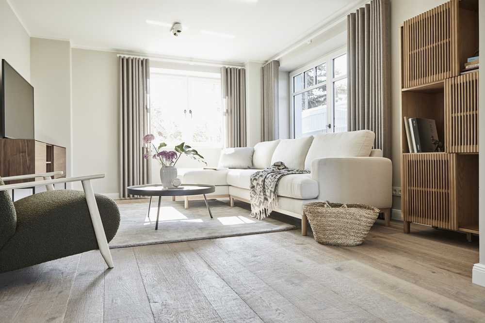 Das Erdgeschoss verfügt über einen großen Wohnraum mit abgegrenztem, aber offenem Küchenbereich. Die Markenküche ist mit Miele-Geräten ausgestattet. Mittelpunkt des Wohnbereichs ist der gemütliche Holz-Kamin. Das Reetdach, die skandinavischen Holzfenster und das Echtholz-Parkett prägen das Wohngefühl. Das Interieur Design arbeitet mit naturnahen Materialien und erzeugt Gemütlichkeit.