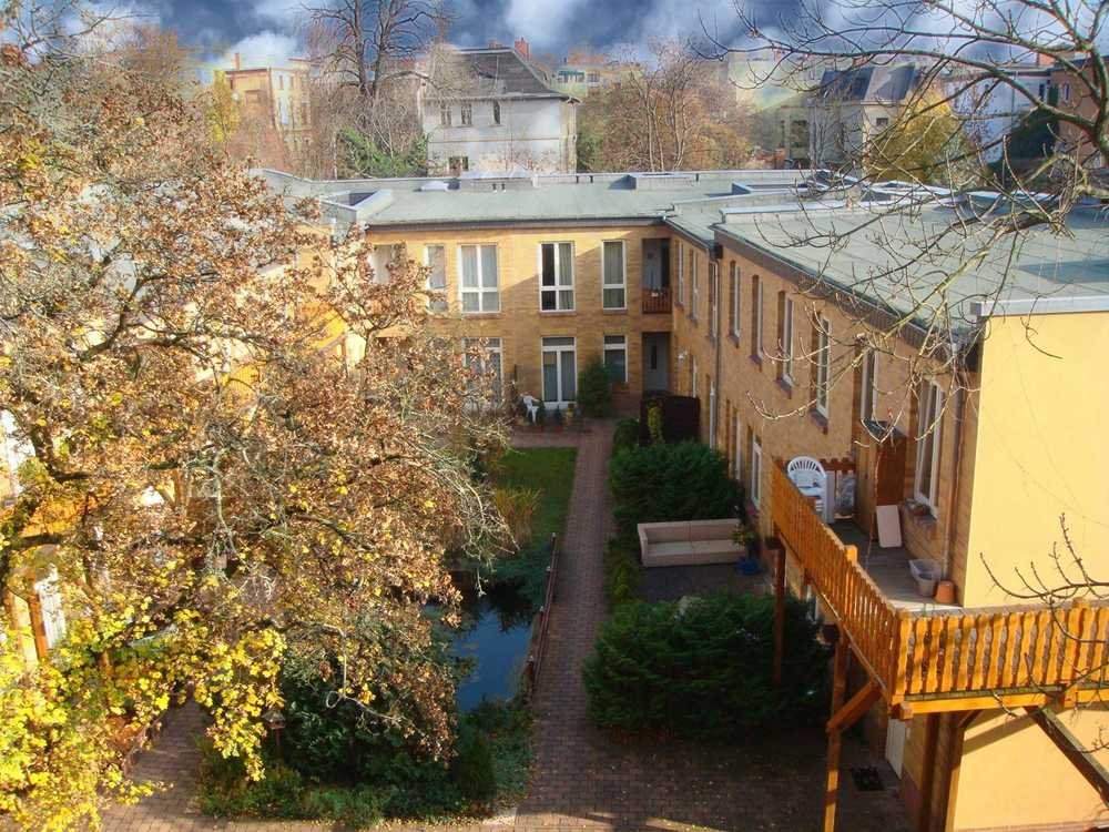 Das hier angebotene Objekt befindet sich auf der straßenabgewandten Seite des insgesamt 1560m² großen Grundstücks. Der parkähnlich gestaltete Innenhof mit Rasenfläche, einem kleinen Teich und Sträuchern kontrastiert angenehm mit der gelben Klinkerfassade der im Reihenhausstil angelegten Wohnungen.