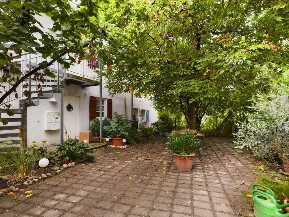 Der Zugang erfolgt über einen wunderschön begrünten Innenhof im Atriumstil - dieser lädt besonders im Sommer zum Verweilen und Feiern mit Freunden und Nachbarn ein.