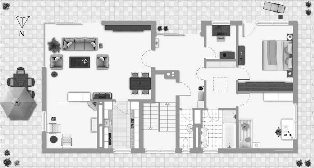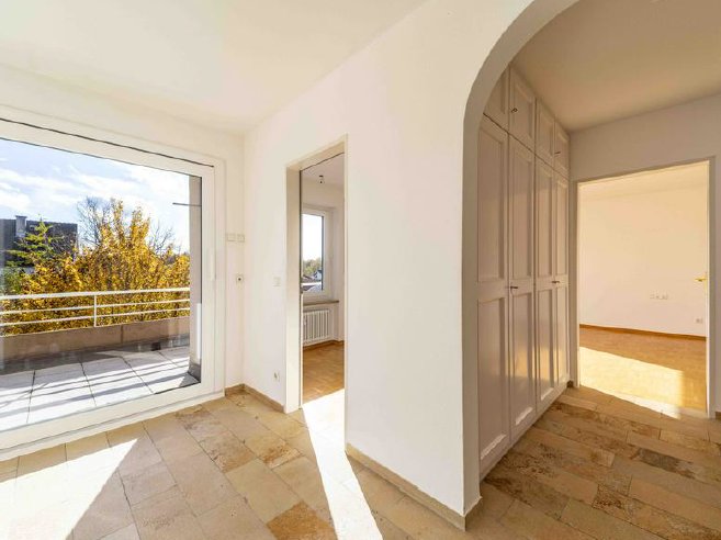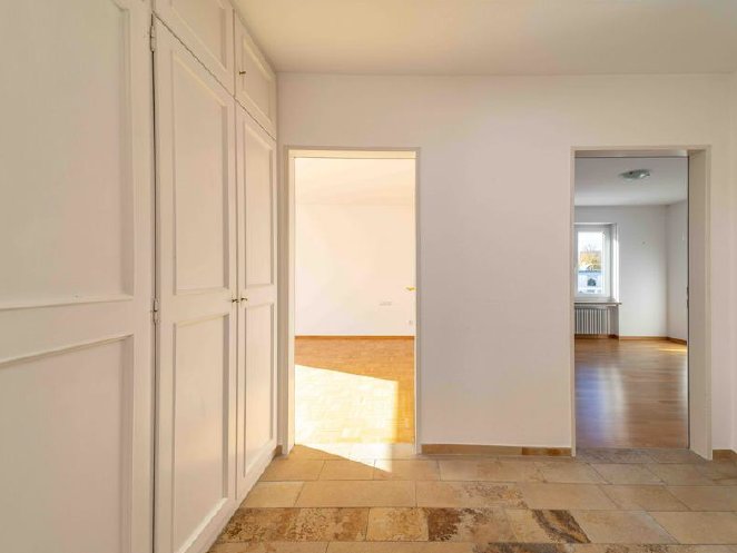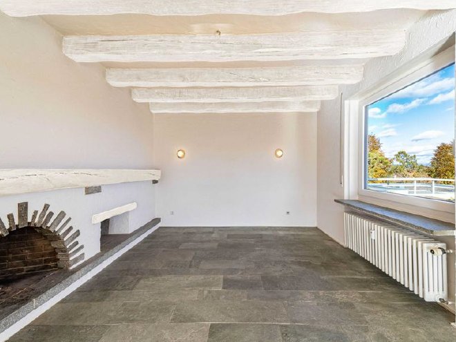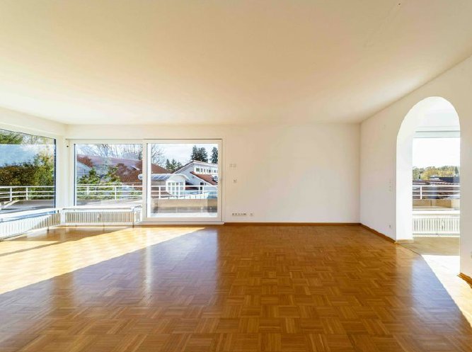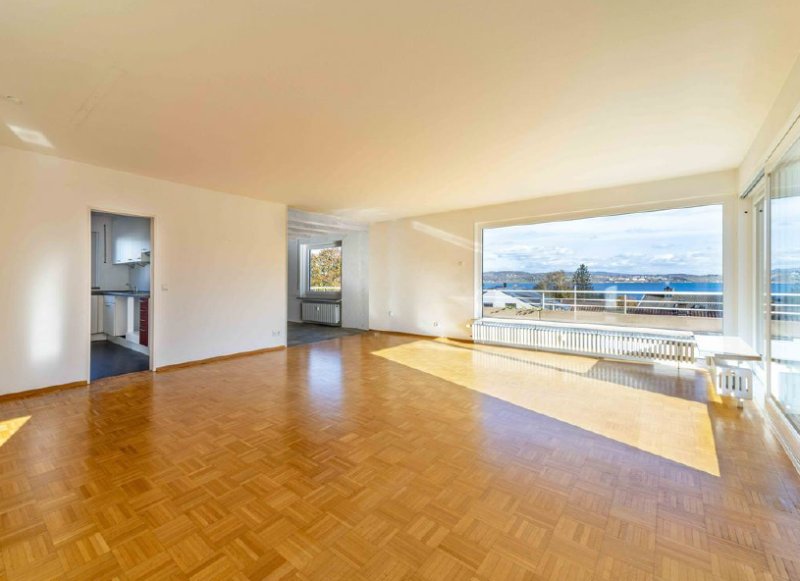 Beim Betreten der Wohnung fällt die besondere Aufteilung der Wohnung auf. In Blickrichtung zum See befinden sich Küche, Wohn-und Essbereich sowie das charmante Kaminzimmer, welches über eine weiße Schiebetür mit dem Wohnzimmer verbunden ist. Zwei Schlafzimmer, ein Büro, eine Diele mit Oberlicht, das Tageslichtbadezimmer und das Gäste-WC liegen auf der Süd-westseite der Immobilie. Die in 2022 renovierten, bodentiefen Fenster fluten die Wohnung mit Licht und lassen die Räume noch größer Wirken.