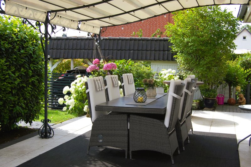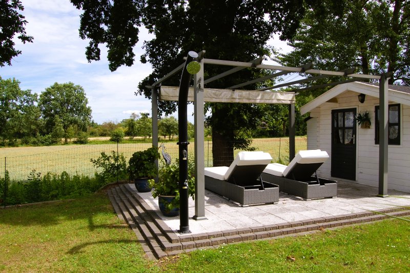 Von der Terrasse mit Pergola können Sie die unberührte Natur in vollen Zügen genießen. Hier wird jeder Feierabend zu einem erholsamen Erlebnis. Dank eines Höhenunterschiedes von ca. 1,2 m bietet sich Ihnen eine atemberaubende Weitsicht, vergleichbar mit der von einem kleinen Hügel. Beobachten Sie die heimische Tierwelt: Rehe, Feldhasen, Störche und auch Raben, die in beeindruckender Weise ihr Revier gegen Greifvögel verteidigen.