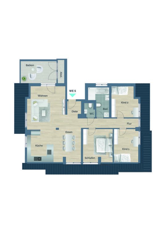 Die offene Küche ist modern gestaltet. Der angrenzende Essbereich lädt zu geselligen Mahlzeiten ein und bietet ausreichend Platz für Ihre Familie und Gäste. Zudem verfügt die Wohnung über drei gemütliche Schlafzimmer, die individuell genutzt werden können, sowie ein stilvolles Badezimmer mit einer großzügigen, begehbaren Dusche und hochwertigen Sanitäranlagen. Ein zusätzliches separates WC sowie ein praktischer Abstellraum innerhalb der Wohnung bieten Ihnen weiteren Komfort und Stauraum für Haushaltsgegenstände.