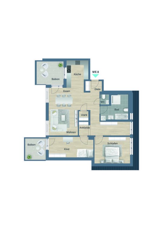 Die offene Küche ist modern gestaltet. Der angrenzende Essbereich lädt zu geselligen Mahlzeiten ein und bietet ausreichend Platz für Ihre Familie und Gäste. Zudem verfügt die Wohnung über zwei gemütliche Schlafzimmer, die individuell genutzt werden können, sowie ein stilvolles Badezimmer mit einer großzügigen, begehbaren Dusche und hochwertigen Sanitäranlagen. Ein zusätzliches separates WC sowie ein praktischer Abstellraum innerhalb der Wohnung bieten Ihnen weiteren Komfort und Stauraum für Haushaltsgegenstände.