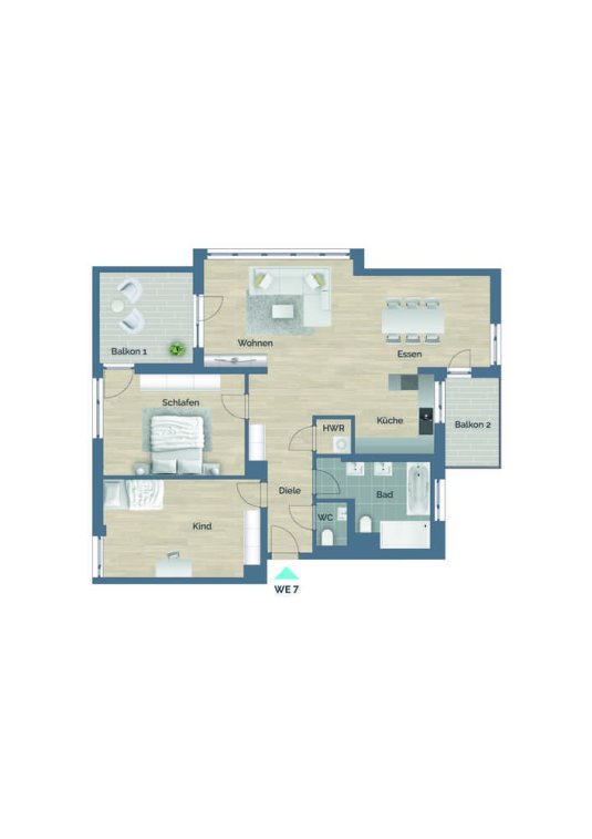 Die offene Küche ist modern gestaltet. Der angrenzende Essbereich lädt zu geselligen Mahlzeiten ein und bietet ausreichend Platz für Ihre Familie und Gäste. Zudem verfügt die Wohnung über zwei gemütliche Schlafzimmer, die individuell genutzt werden können, sowie ein stilvolles Badezimmer mit einer großzügigen, begehbaren Dusche und hochwertigen Sanitäranlagen. Ein zusätzliches separates WC sowie ein praktischer Abstellraum innerhalb der Wohnung bieten Ihnen weiteren Komfort und Stauraum für Haushaltsgegenstände.