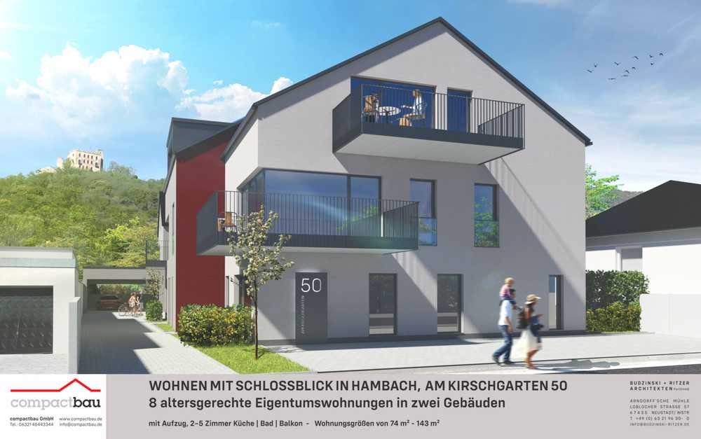 Am Fuße des Hambacher Schlosses werden insgesamt acht barrierefreie Eigentumswohnungen errichtet. Diese teilen sich auf zwei Häuser auf: Fünf Wohnungen werden im vorderen Gebäude realisiert, derer drei im hinteren Gebäude. Alle Wohnungen sind barrierefrei erreichbar, da die beiden Gebäude durch einen Aufzug mit Zuwegung verbunden werden. Stellplätze und Carports, ggf. auch Garagen, werden zudem auf dem Grundstück umgesetzt.