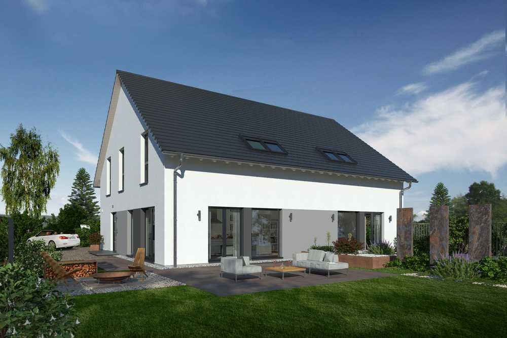 Das ist unser Doppelhaus 05. Hier sind in den jeweils knapp 80 m2 großen Erdgeschossen die Übergänge fließend – und sorgen auf diese Weise für ein außergewöhnliches Wohnerlebnis. Das zentral gelegene Treppenhaus trennt Eingangsbereiche beziehungsweise Nutzräume mit HWR und Gäste-WC von dem hellen Wohn-Koch-Ess-Bereich, der mit seiner Größe von mehr als 45 m2 den Mittelpunkt des Hauses bildet. Im Obergeschoss: ein Elternschlafzimmer mit integrierter Ankleide, zwei Kinderzimmer sowie ein Badezimmer mit Wanne, Dusche und WC.