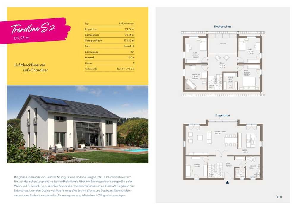 Die große Glasfassade vom Trendline S2 sorgt für eine moderne Design-Optik. Im Innenbereich setz sich fort, was das Äußere verspricht: viel Licht und helle Räume. Über den Eingangsbereich gelangen Sie in den Wohn- und Essbereich. Ein zusätzliches Zimmer, der Hauswirtschaftsraum und ein Gäste-WC ergänzen das Erdgeschoss. Unter dem Dach ist viel Platz für ein großes Bad mit Wanne und Dusche, ein Elternschlafzimmer und zwei Kinderzimmer.
