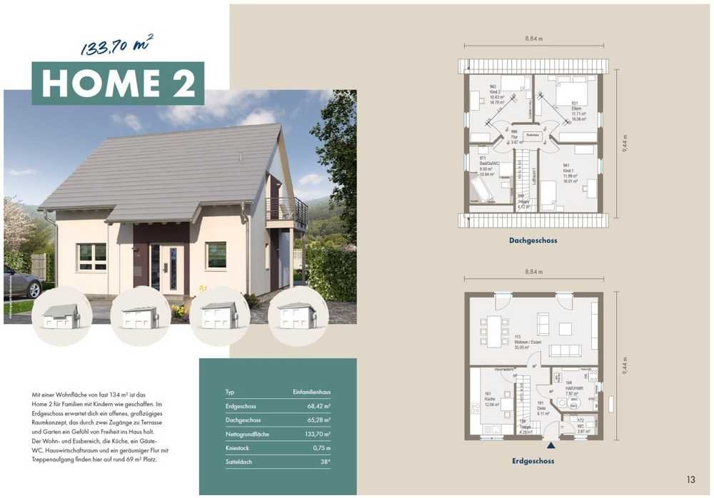 Mit einer Wohnfläche von fast 134 m² ist das Home 2 für Familien mit Kindern wie geschaffen. Im Erdgeschoss erwartet dich ein offenes, großzügiges Raumkonzept, das durch zwei Zugänge zu Terrasse und Garten ein Gefühl von Freiheit ins Haus holt. Der Wohn- und Essbereich, die Küche, ein Gäste- WC, Hauswirtschaftsraum und ein geräumiger Flur mit Treppenaufgang finden hier auf rund 69 m² Platz.