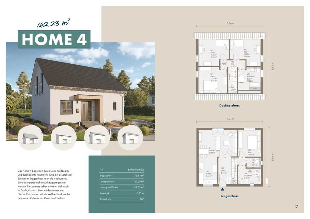 Durch die offene und großzügige Raumgestaltung im Erdgeschoss ermöglicht euch unser Home 4 ein individuelles Wohnerlebnis ganz nach euren eigenen Vorstellungen. Mit drei Schlafzimmern und einem geräumigen Badezimmer bietet auch das Dachgeschoss ausreichend Platz für die ganze Familie.