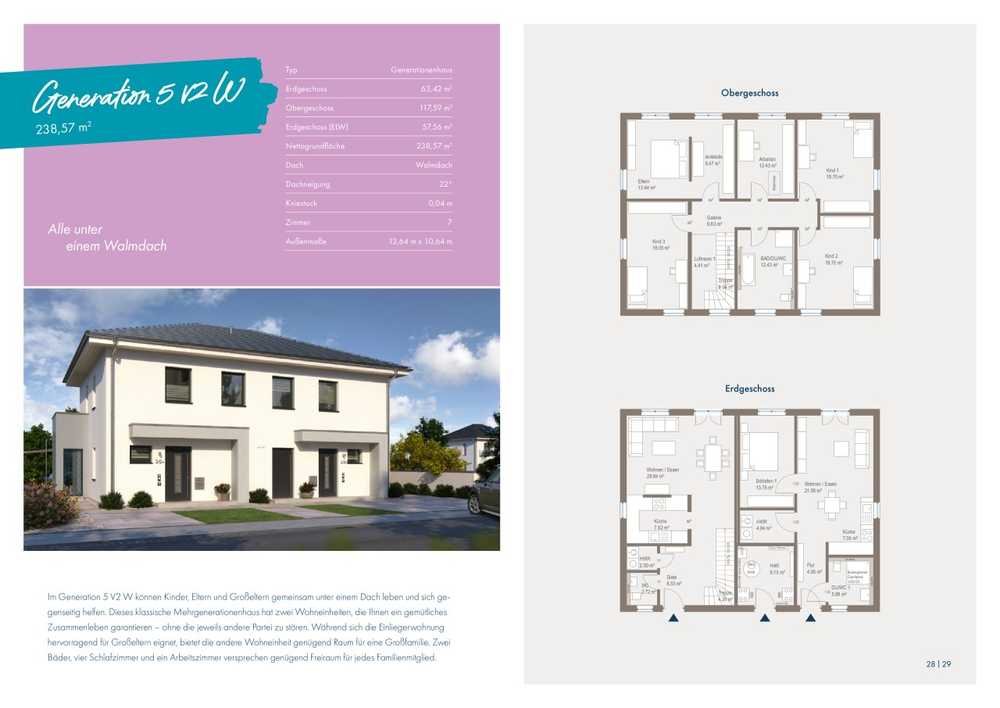 Das Generation 5 v2 W präsentiert sich klassisch und stilvoll. Hier kann die ganze Familie unter einem Dach leben. Es treffen zwei Wohneinheiten zusammen, die ein gemütliches Zusammenleben garantieren, ohne die jeweils andere Partei zu stören. Während sich die Einliegerwohnung hervorragend für Großeltern oder ein weiteres Paar eignet, bietet die zweite Wohneinheit genügend Raum für eine Großfamilie. Zwei Bäder, drei Kinder- sowie ein Arbeitszimmer ermöglichen jedem Familienmitglied genügend Freiraum.