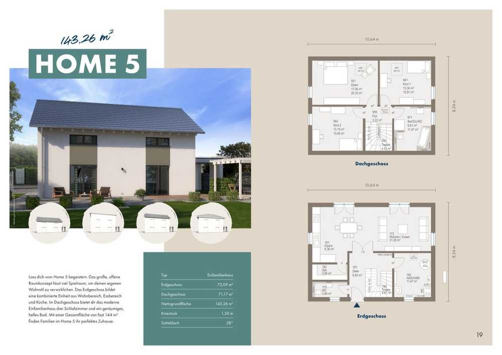 Das große, offene Raumkonzept lässt viel Spielraum, um deinen eigenen Wohnstil zu verwirklichen. Das Erdgeschoss bildet eine kombinierte Einheit aus Wohnbereich, Essbereich und Küche. Im Dachgeschoss bietet dir das moderne Einfamilienhaus drei Schlafzimmer und ein geräumiges, helles Bad. Mit einer Gesamtfläche von fast 144 m² finden Familien im Home 5 ihr perfektes Zuhause.