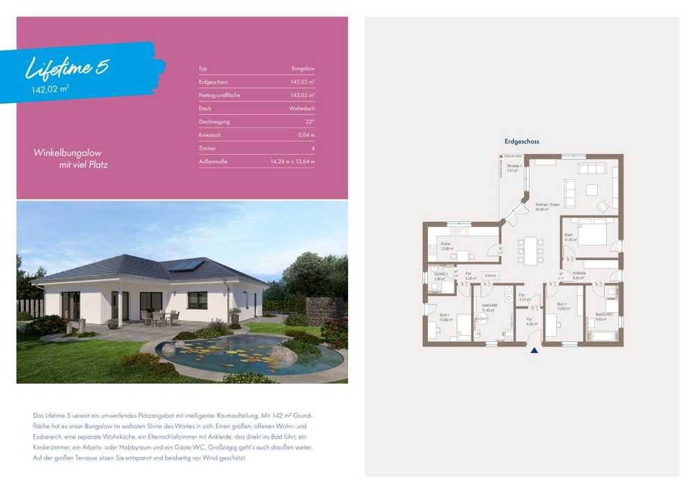 Unser Haustyp Lifetime 5 vereint ein umwerfendes Platzangebot mit intelligenter Raumaufteilung. Der Winkelbungalow bietet ein Elternschlafzimmer mit Ankleide, welche direkt ins Bad führt, ein Kinderzimmer, Platz für einen Arbeitsraum, Gäste-WC und Küche auf einer Ebene. Zusätzlich sind Sie auf der großen Terrasse beidseitig vor Wind geschützt. Ein optimales Haus, welches keine Wünsche offen lässt.