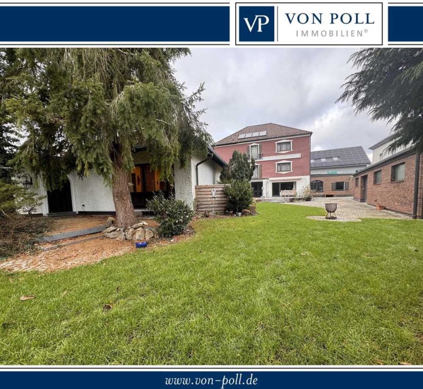 Das Wohn- und Geschäftshaus besteht aus zwei miteinander verbundenen Gebäuden, die durch zwei separate Einfahrten auf das große Grundstück zugänglich sind.