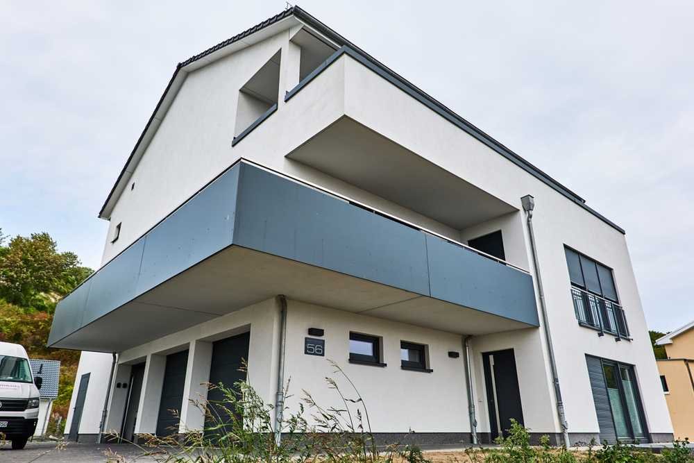 Das 2. Obergeschoss bildet den zentralen Wohnbereich mit einem offenen Wohn-, Koch- und Essbereich. Die luxuriöse Küche besticht durch ihr stilvolles Design: Hochglanz-weiße Fronten harmonieren perfekt mit Korpussen in Betonoptik. Zudem ist die Küche praktisch mit einem angrenzenden Vorratsraum verbunden, was den Alltag erleichtert.