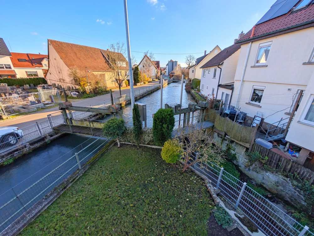 Das 1. OG verteilt sich auf ein gemütliches Wohnzimmer, ein Esszimmer, ein Tageslichtbad, eine Küche sowie ein Schlafzimmer mit direktem Zugang zur großen Terrasse in Südausrichtung mit Blick auf den Garten und den Steidenbach.