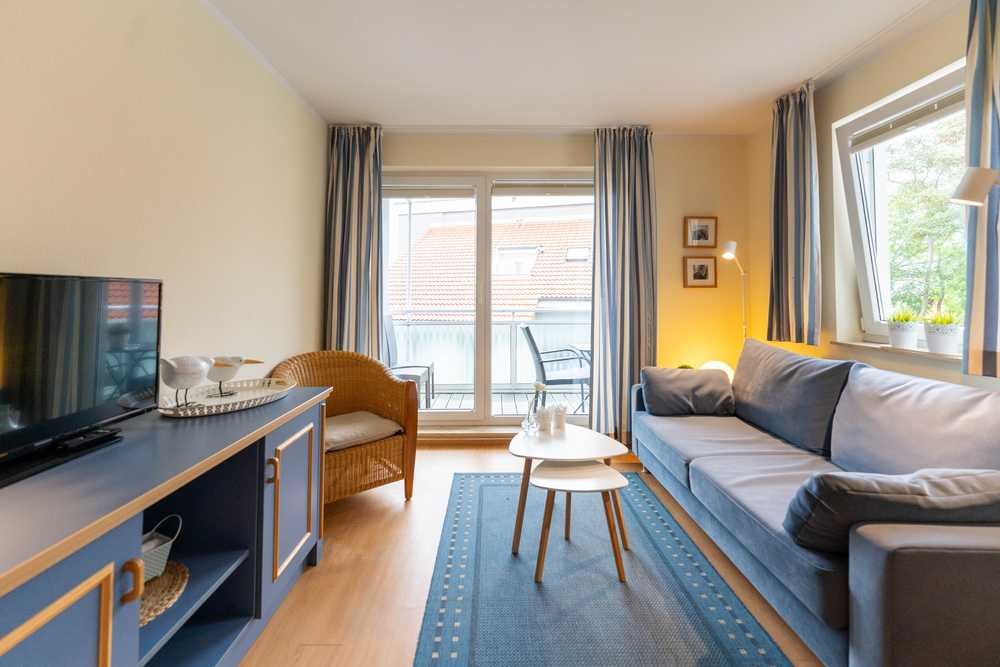 Auf ca. 38 m² Wohnfläche bietet die Wohnung einen optimal genutzten Grundriss. Das helle Wohnzimmer mit integrierter Küchenzeile (2019 modernisiert) lädt zum Verweilen ein und geht nahtlos in den gemütlichen Balkon über, auf dem Sie die frische Meeresbrise genießen können.