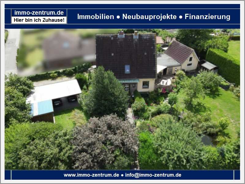 Das Grundstück überzeugt mit zahlreichen Highlights: Ein separates Nebengebäude mit Doppelgarage, ein gemütliches Gartenhaus, eine moderne und geschützte Terrasse sowie ein großzügiger Holzunterstand mit Satteldach bieten vielfältige Nutzungsmöglichkeiten. Eine weitläufige Auffahrt mit elektrischem Tor sorgt für Komfort, während ein idyllischer Naturteich mit Fischbesatz (darunter Kois) eine besondere Atmosphäre schafft. Ergänzt wird das Außengelände durch ein Carport mit Platz für drei Fahrzeuge und angrenzendem Schuppen. Die gesamte Außenanlage präsentiert sich äußerst gepflegt. Eine Teichbrücke aus Holz mit Edelstahlgeländer führt zum Eingangsbereich des Hauses.