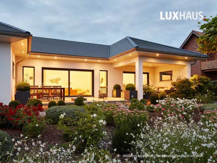 Ein klassischer Bungalow mit Walmdach, auf dessen Gartenseite sich dank des raffiniert angedeuteten U’s eine reizvolle Außenanlage ergibt, die teils überdacht, halb offen viel Raum bietet.