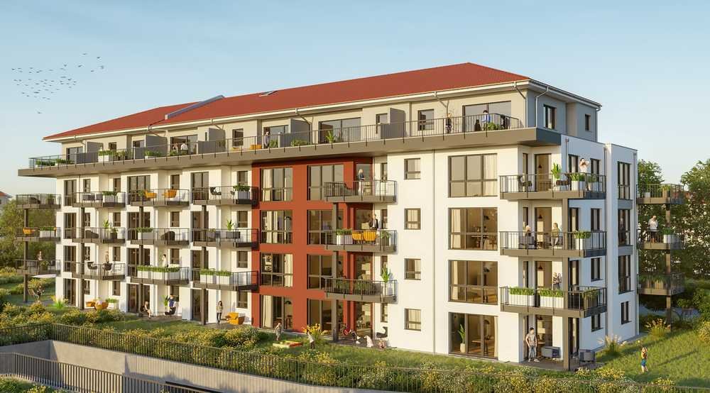 Das Gebäude wird in solider Mauerwerksbauweise errichtet und erfüllt alle Anforderungen gemäß GEG 2024. Fundamente und Bodenplatte werden in Beton ausgeführt. Die Außenwände sowie die tragenden Innenwände werden aus Kalksandstein bzw. Stahlbeton hergestellt. Die Geschossdecken und Geschosstreppen sind ebenfalls aus Stahlbeton gefertigt. Sie werden mit polierten Granitstufen belegt. Auf das Außenmauerwerk wird ein Wärmedämmverbundsystem (WDVS) aufgebracht.